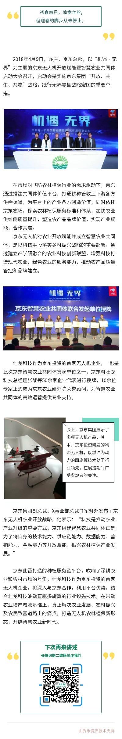 2018年4月9日,京東總部,以“機(jī)遇?無(wú)界”為主題的京東無(wú)人機(jī)開放賦能暨智慧農(nóng)業(yè)共同體啟動(dòng)大會(huì)召開,壯龍科技作為京東投資的首家無(wú)人機(jī)企業(yè),也是此次京東智慧農(nóng)業(yè)共同體的發(fā)起單位之一,將深入與京東合作,打造無(wú)人機(jī)農(nóng)林植保新形態(tài),開辟智慧農(nóng)業(yè)新時(shí)代。